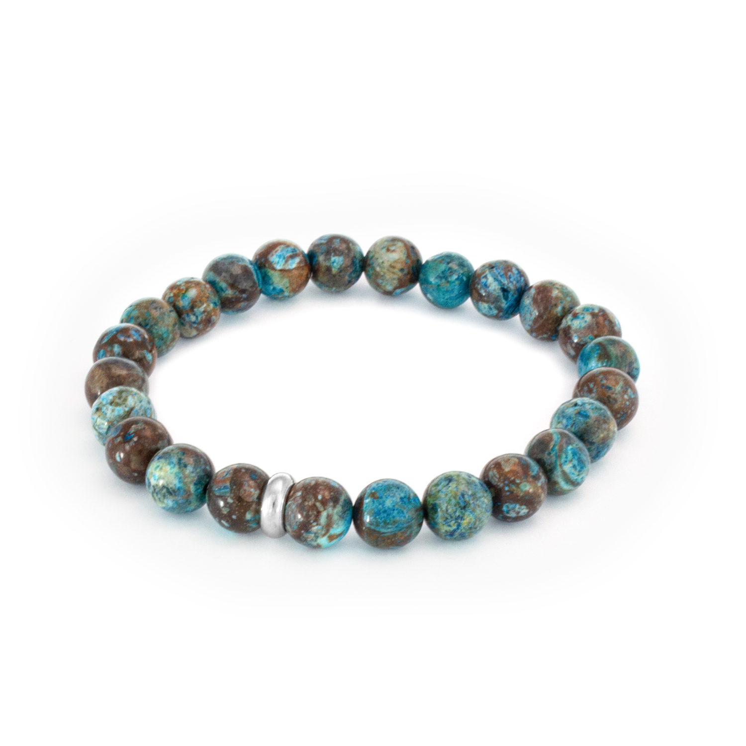 Náramek je vyroben z kamene jaspis o velikosti 8mm, přídavné komponenty jsou z chirurgické oceli.