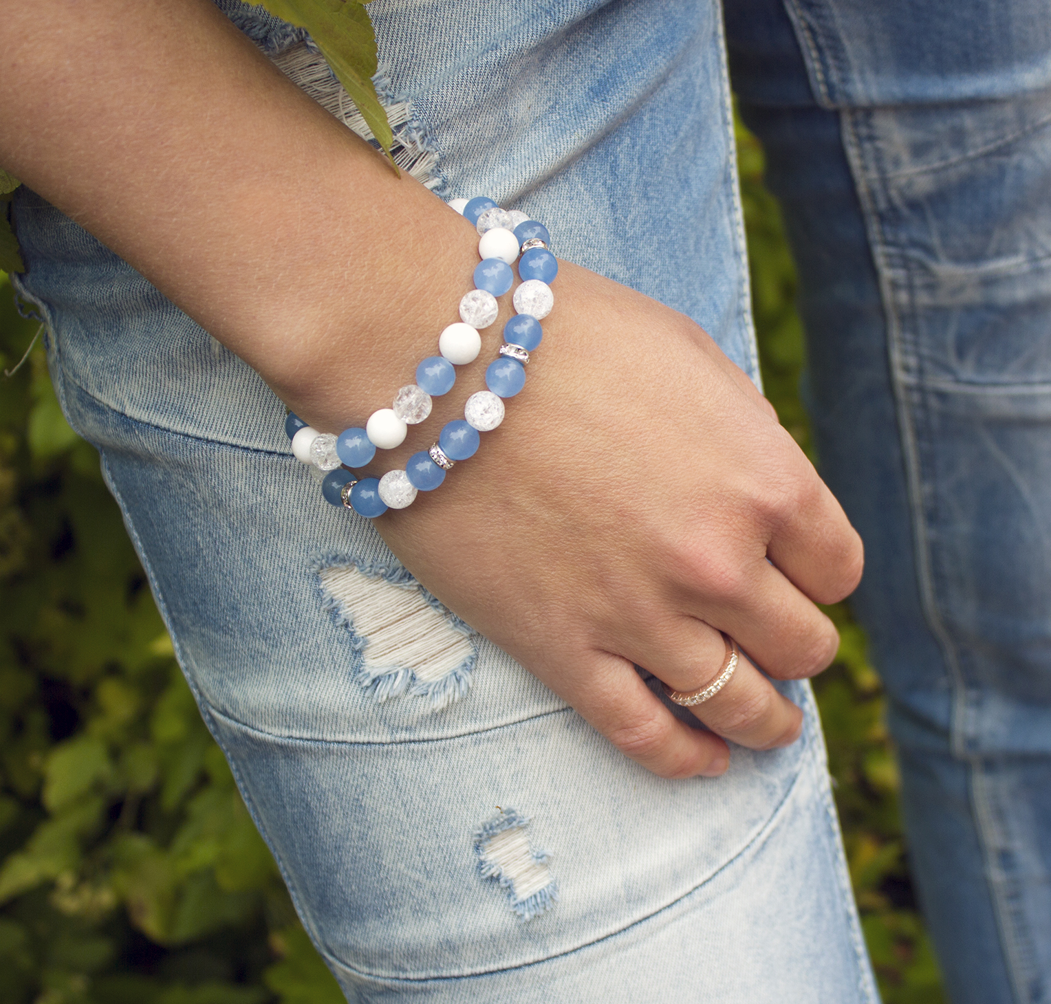Náramek je vyroben z kamenů malajský nefrit modrý, praskaný křišťál o velikosti 8mm, přídavné komponenty jsou z chirurgické oceli.
